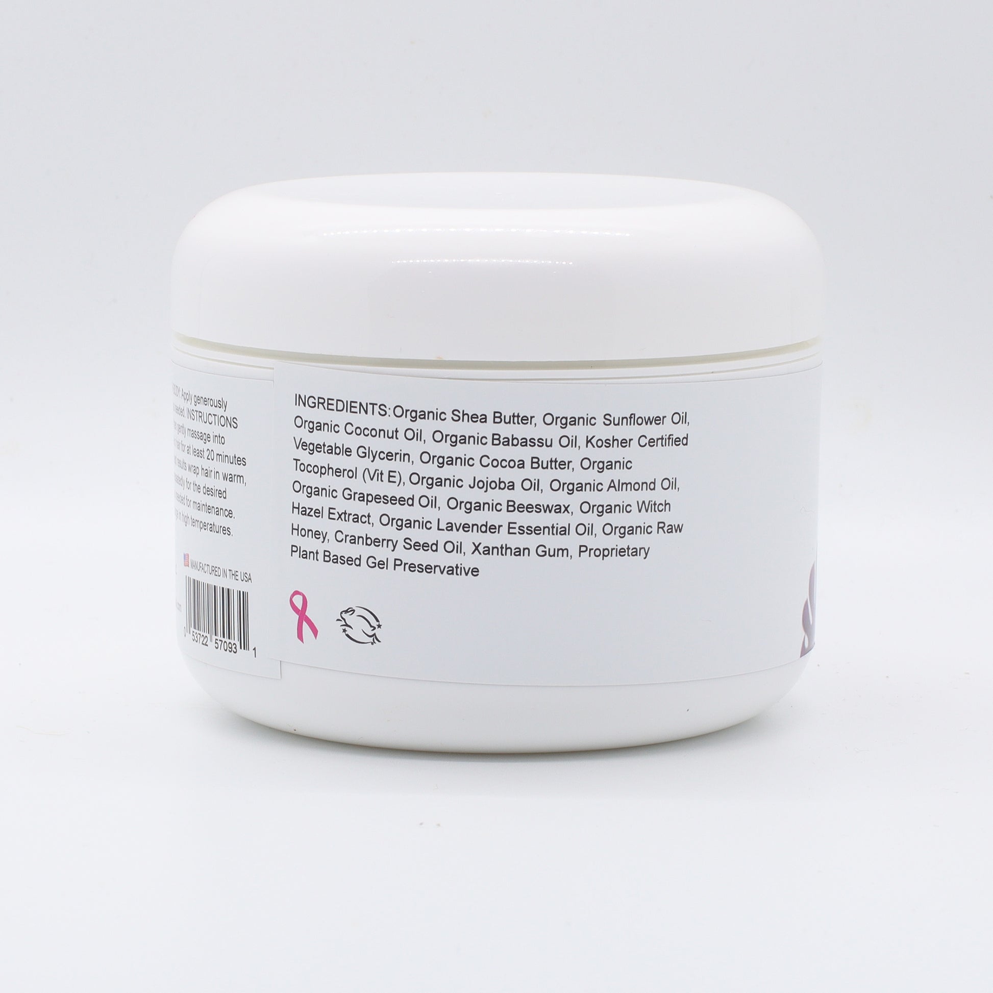 Ingredients: Organic Shea Butter, Organic Sunflower Oil, Organic Coconut Oil, Organic Babassu Oil, Organic Vegetable Glycerin, Organic Cocoa Butter, Organic Calendula Oil, Organic Jojoba Oil, Organic Arrowroot Powder, Organic Beeswax, Organic Witch Hazel Extract, Organic Sweet Lavandin Essential Oil, and Organic Raw Honey.