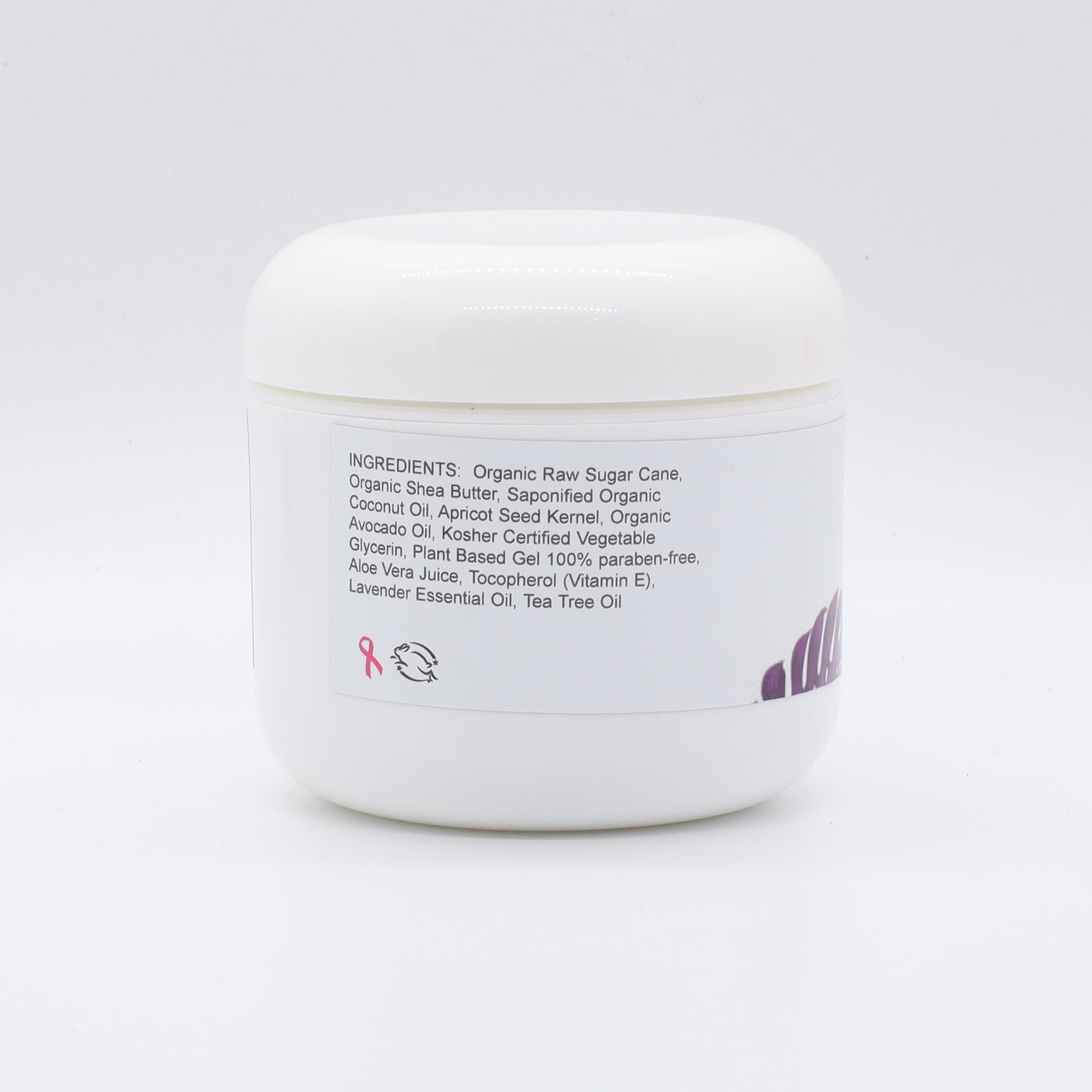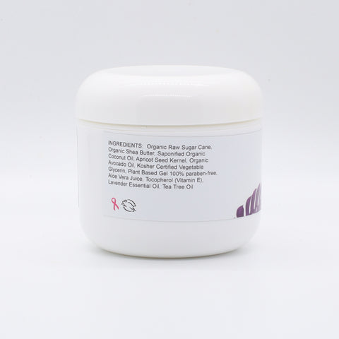 Ingredients: Organic Raw Sugar Cane, Organic Shea Butter, Saponified Organic Coconut Oil, Apricot Seed Kernel, Organic Avocado Oil, Kosher Certified Vegetable Glycerin, Plant Based Gel 100% paraben-free, Aloe Vera Juice, Tocopherol (Vitamin E), Lavender Essential Oil, Tea Tree Oil