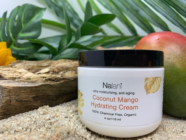 Our lush Coconut Mango Hydrating Cream is an imported formula manufactured in the U.S.A. It contains herbs and other organic ingredients that we have carefully chosen to repair your injured skin cells and delay the aging process. Here's a list of what some of these incredible ingredients do for your skin: mango butter prevents dry skin, dermatitis, and radiation damage; babassu oil destroys free radicals; avocado oil efficaciously cures acne and blackheads; and jojoba oil, combined with organic raw honey, combats creases and wrinkles.